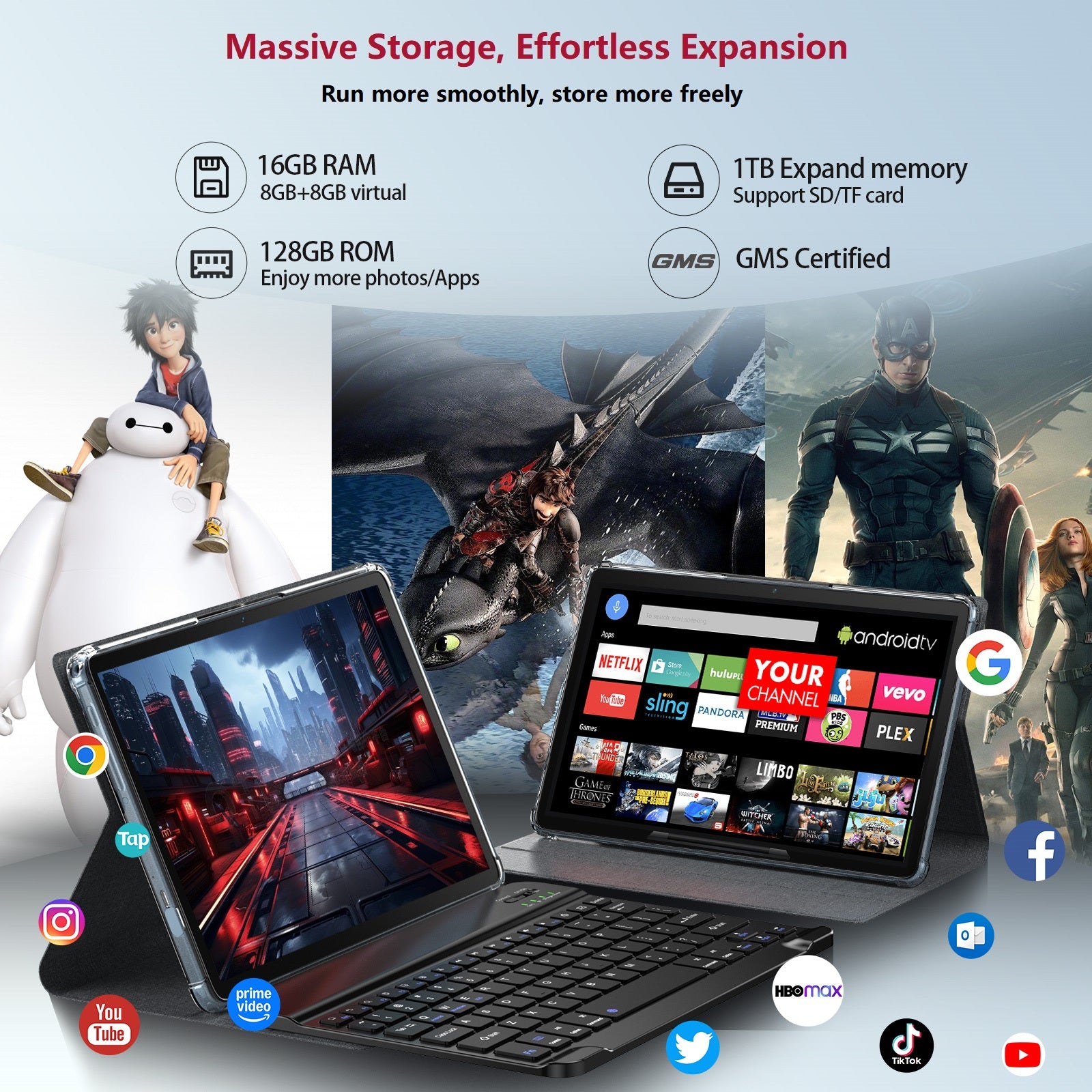 - Android 15 tablet combination of 16(8+8Virtual)GB RAM and 256GB ROM and 2TB microSD expansion card (not included).128GB tablet provides convenient storage for photos, movies, games, documents, and essential files with quick access capabilities.GMS certified to support browsing and downloading of many apps for high compatibility. You can download your favorite apps such as Netflix, TikTok, Facebook, Instagram,Twitter, YouTube,and other apps you want.